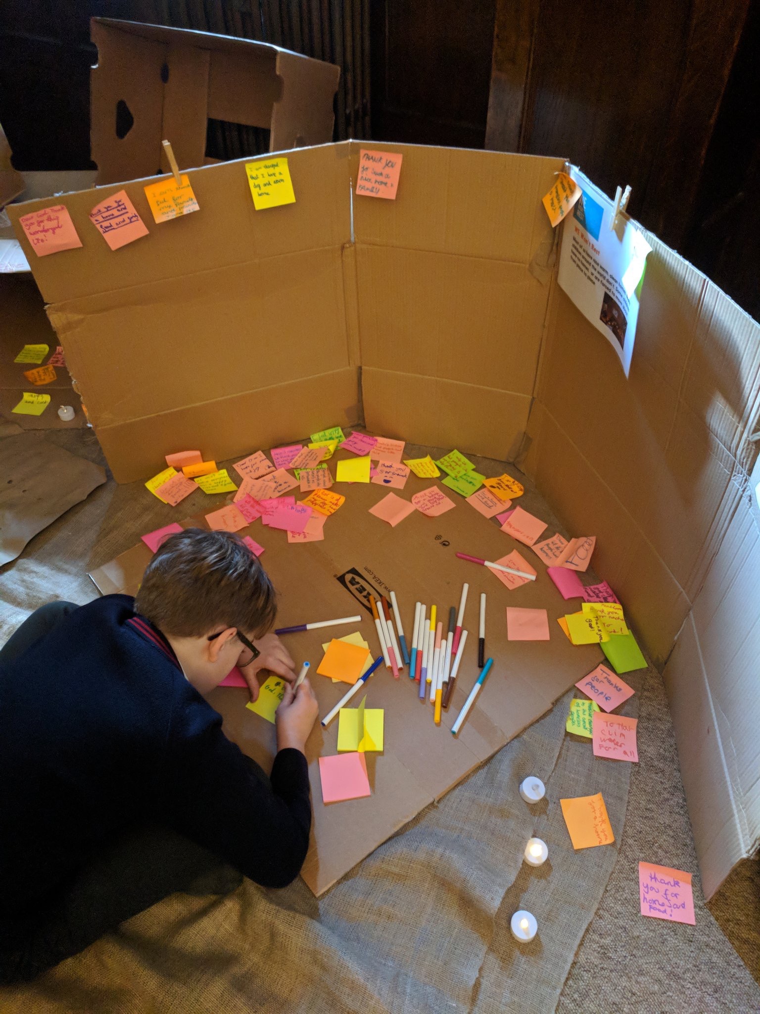 This activity works best when the cardboard box(es) used are big enough for the pupils to get inside of. This ensures that the activity remains exciting for the pupils as they sit inside, imagining what it would be like. It also means that there will be more room for them to draw or write down their prayers.